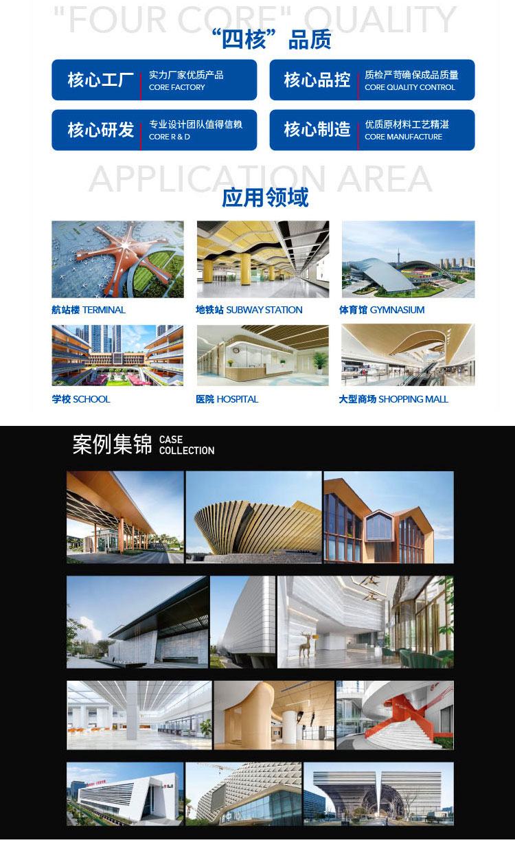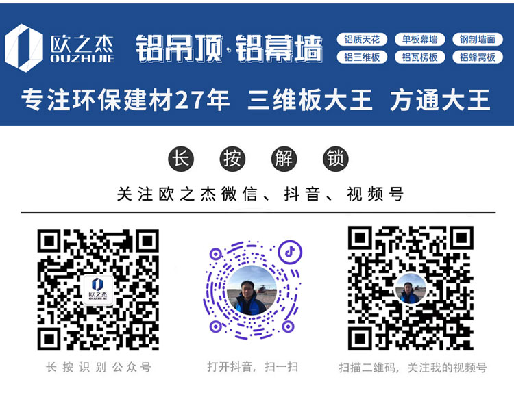 鋁蜂窩板采用熱壓成型技術(shù),用蜂窩板比重輕、強(qiáng)度高、結(jié)構(gòu)穩(wěn)定、抗風(fēng)壓好,具有相同的蜂窩夾層板重量僅為鋁板的 1/5,鋼板的1/10。因鋁皮和蜂窩間的高熱傳導(dǎo)值,內(nèi)外鋁皮的熱脹冷縮同步;蜂窩鋁皮上有小孔,使板內(nèi)氣體可以自由流動(dòng);可滑動(dòng)安裝扣系統(tǒng)在熱脹冷縮時(shí)不會(huì)引起結(jié)構(gòu)變形。其面板主要選用優(yōu)質(zhì)的 3003H24 合金鋁板或 5052AH14 高錳合金鋁板為基材,面板厚度為 0.8~1.5mm 氟碳滾涂板或耐色光烤漆 , 耐色光烤漆在抗劃痕、耐酸雨腐蝕變色、自潔性方面強(qiáng)于 PVDF,底板厚度為 0.6~1.0mm,總厚度為 25mm。
